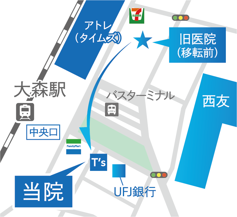 当院は、JR「大森」駅中央口から徒歩すぐ、京浜急行「大森海岸」駅から徒歩8分。バスの場合は京浜急行バス・東急バス「大森駅」停留所から徒歩1分とアクセス良好で、学校やお仕事の帰り、お買い物のついでにも立ち寄りやすい立地です。